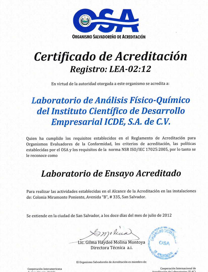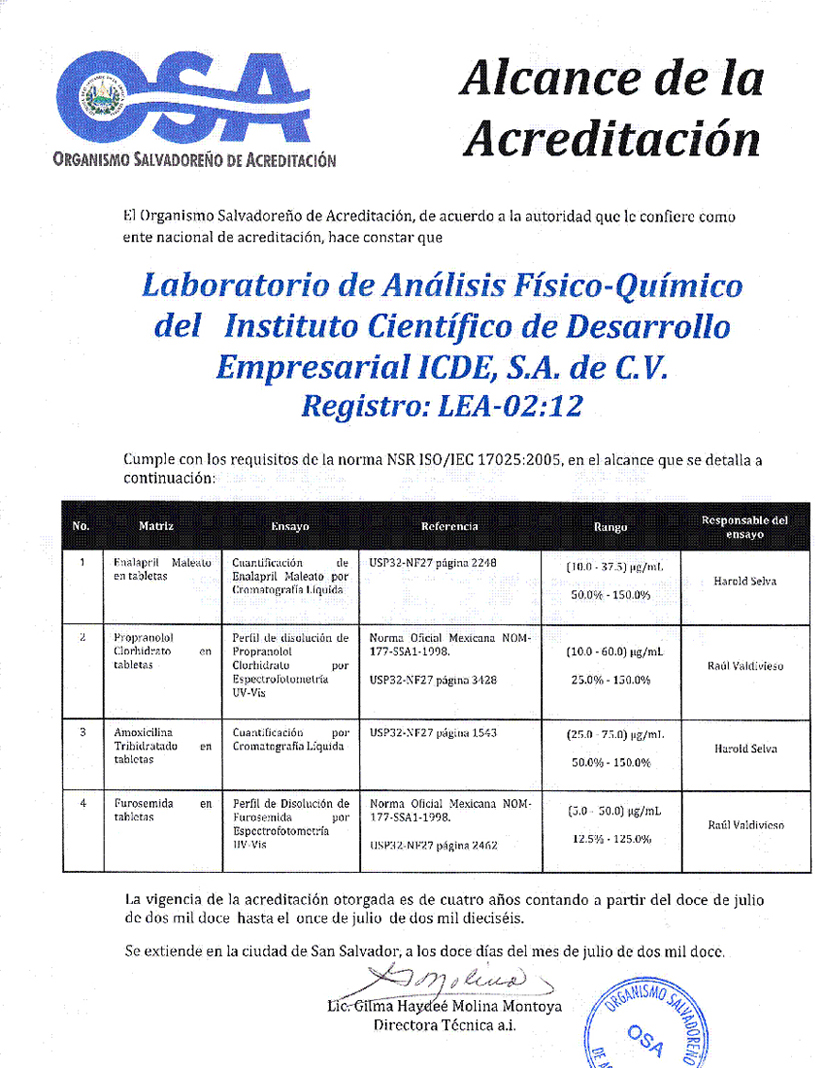 Nuestro laboratorio de análisis ha sido Acreditado por el Organismo Salvadoreño de Acreditación (OSA) bajo la norma ISO/IEC 17025:2005 para la realización de pruebas específicas en medicamentos de acuerdo al Alcance establecido.